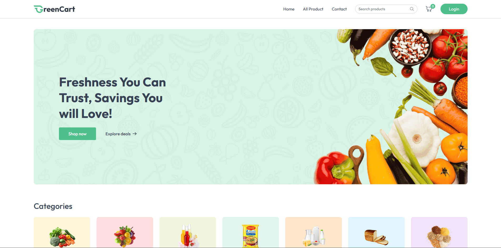 GreenCart is a fast grocery delivery web app inspired by Blinkit, built entirely in JavaScript. Users can browse categorized grocery products, manage their cart, and place orders through a clean and responsive interface. The platform features JWT-based authentication, real-time cart sync, and a fully functional order management flow — all powered by a vanilla JS stack from frontend to backend.